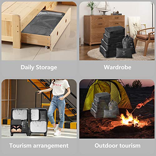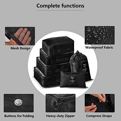 TARFEPA - مجموعة من 6 مكعبات تعبئة مضغوطة لشنط السفر، اكسسوارات امتعة السفر مع شنطة احذية وشنطة ادوات الزينة وشنطة ملابس داخلية، منظم شنط سفر قابل للطي لتخزين الامتعة، اسود، نايلون