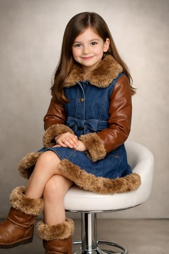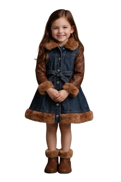 Generic - جاكيت جينز للبنات بأكمام جلدية وفرو صناعي، أزرق وهافان، مقاس 4، بحزام وأزرار، موديل 655-410