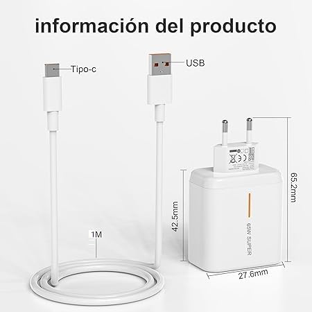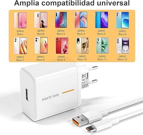 Generic - شاحن سريع 65 واط مع كابل USB C بطول 1 م، متوافق مع موبايلات اوبو رينو 8 تي وفايند N2 وفليب X5 برو وX5 لايت وX3 نيو وX3 برو ورينو 7 برو و6 برو وA54 وA57، بالإضافة إلى ون بلس 11 و10T ونورد 2T
