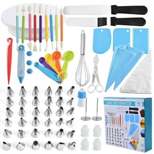 Generic - مجموعة تزيين الكيك المثالية من 66 قطعة مع اكياس تزيين كريمية وملاعق مسطحة وادوات تشكيل وحامل كيك دوار للخبازين في المنزل والمبتدئين