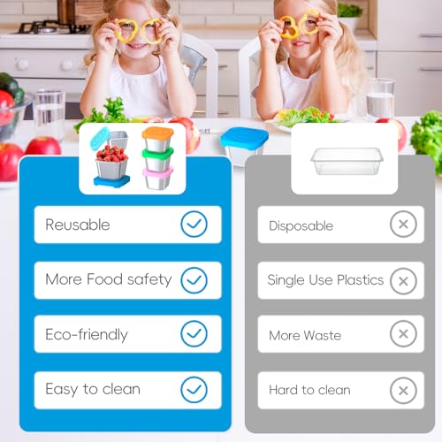 - مادة آمنة وصحية: علب الوجبات الخفيفة القابلة لإعادة الاستخدام مصنوعة من الفولاذ المقاوم للصدأ الممتاز 18/8 وأغطية سيليكون خالية من مادة البيسفينول أ، مادة آمنة ولا تسرب تبقيها بديلًا رائعًا لعلب الوجبات الخفيفة البلاستيكية.