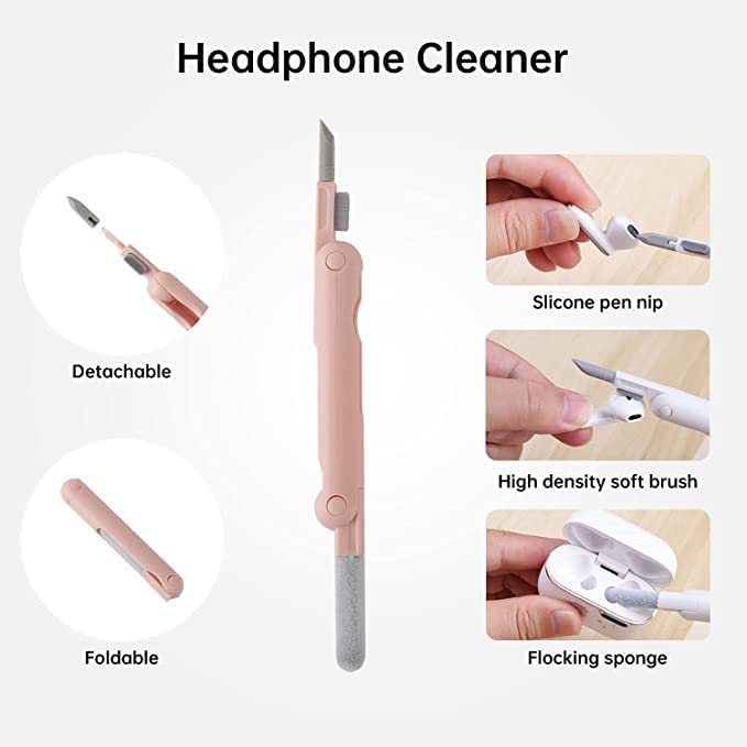 - قلم تنظيف قابل للطي: طرف السيليكون لتنظيف بقع الشقوق، وتستخدم الفرشاة عالية الكثافة لسماعات الأذن وشبكات الهاتف، ويُستخدم الإسفنج المضغوط لتنظيف فتحات علبة شحن سماعات الأذن.