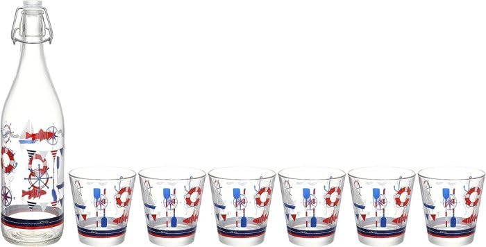 - مجموعة كاملة: تتضمن زجاجة زجاجية أنيقة واحدة مع غطاء علوي متأرجح و6 أكواب شرب مطابقة تتميز بتصميمات بحرية ساحرة باللونين الأحمر والأزرق