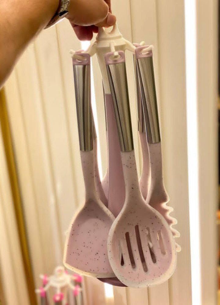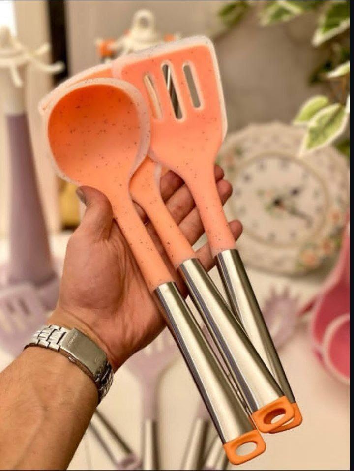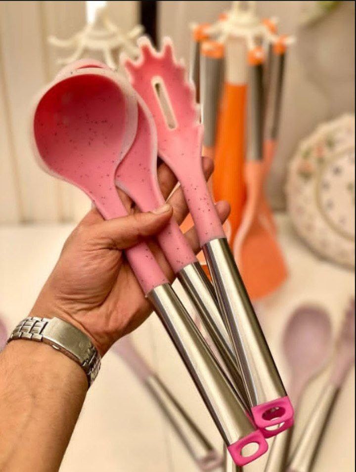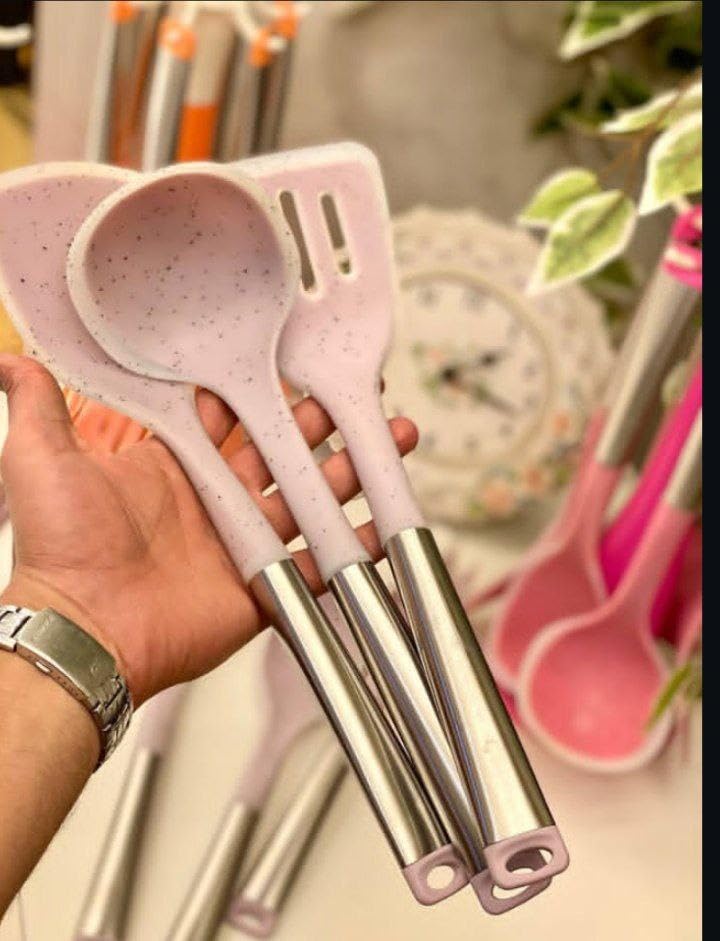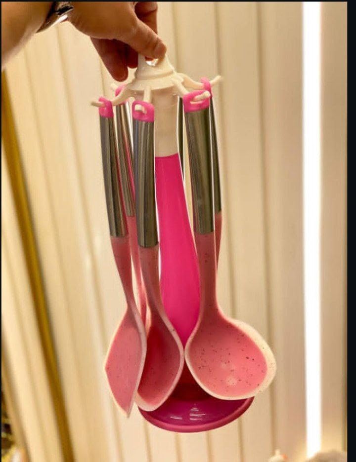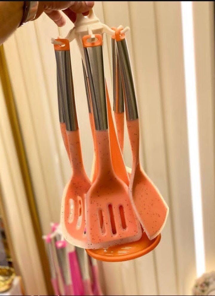 - طقم مكون من 7 قطع عملية للطهي والتوزيع مزود باستاند للتنظيم والحفظ بسهولة سيليكون مقاوم للحرارة لا يلتصق ولا يخدش الأواني مقابض معدنية قوية لسهولة التحكم سهل التنظيف وآمن للاستخدام اليومي تصميم عصري وألوان أنيقة تناسب جميع المطابخ