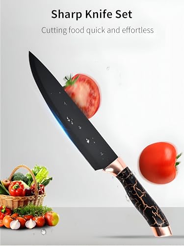 - إن مجموعة سكاكين المطبخ المكونة من 7 قطع مصنوعة من الفولاذ المقاوم للصدأ عالي الجودة، مما يضمن المتانة ومقاومة الصدأ والتآكل، مما يجعلها إضافة تدوم طويلاً لمطبخك.