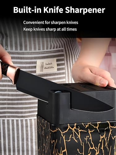 - تأتي المجموعة مع حامل أنيق مقاس 21.5 سم لتخزين وتنظيم مريح، مما يحافظ على تخزين سكاكينك بأمان وسهولة الوصول إليها. وهذا يضيف إلى الأناقة والعملية الشاملة للمجموعة.
