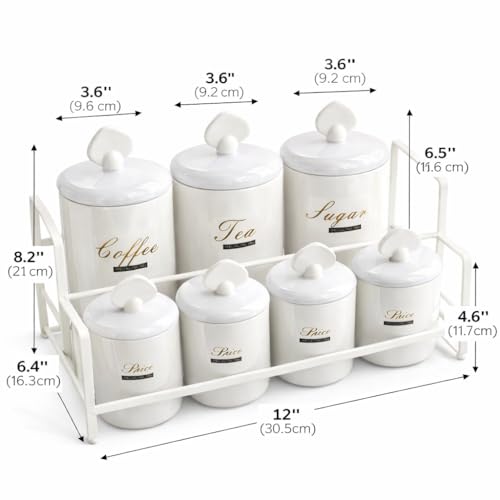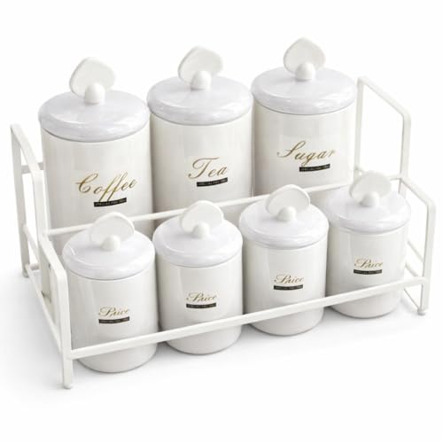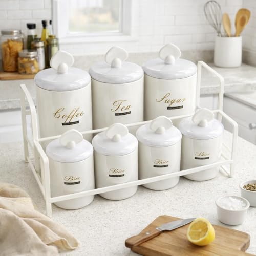 Generic - طقم برطمانات مطبخ سيراميك أبيض 7 قطع مع حامل معدني، للقهوة والشاي والسكر والتوابل، بأغطية محكمة ولمسة لامعة، 30.5 سم