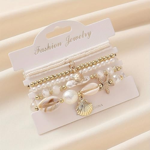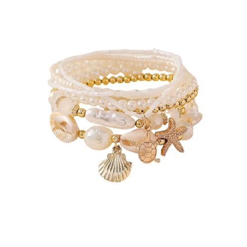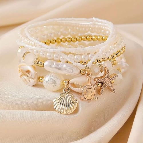 FRIDAYIN - 7 قطع سوار شاطئ صدف نجم البحر نمط المحيط البوهيمي اللؤلؤ سلسلة مجوهرات الشاطئ
