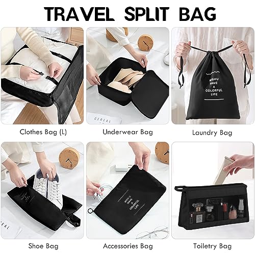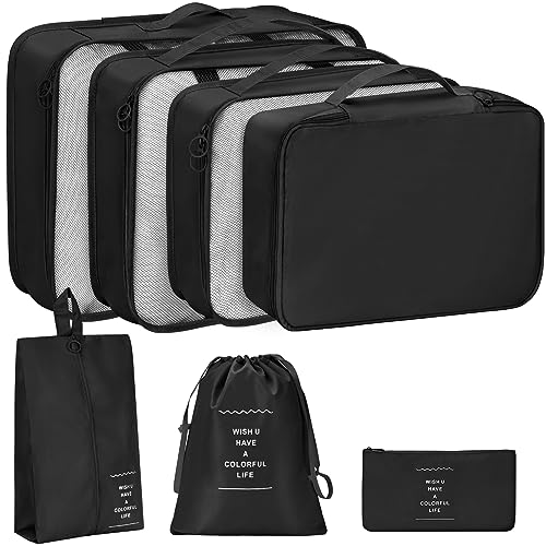 M&C Music Color - مجموعة مكعبات تعبئة للسفر من 7 قطع، منظمات تعبئة الأمتعة لملحقات السفر، منظم شنط السفر للأمتعة ومستلزمات النظافة والأحذية والملابس ومستحضرات التجميل (7 قطع، أسود)
