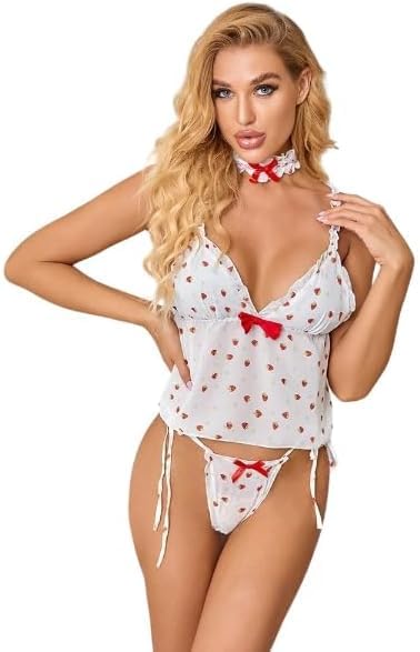 Generic - لانجري بلون أبيض مطبوع بقلوب مع طوق رقبة فيونكة بلون أحمر، قميص داخلي قصير مع رباط جانبي وبانتي مطابق من كيان للتجارة والتوزيع، كود منتج 748