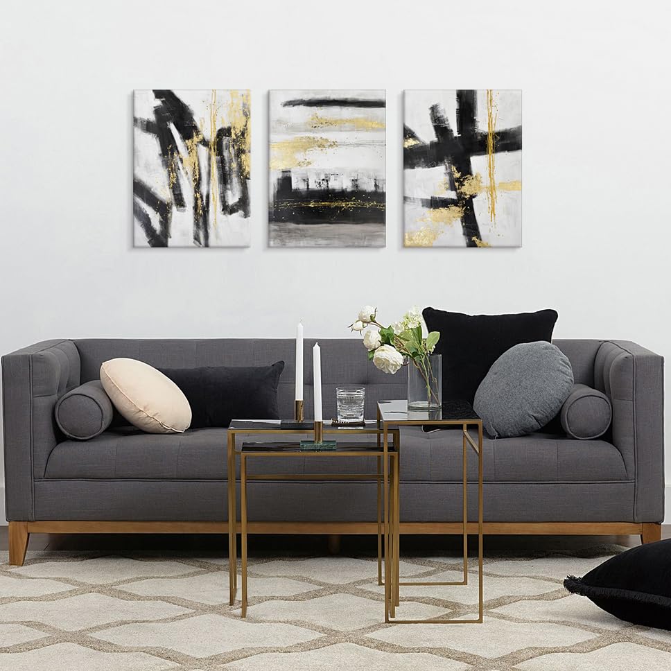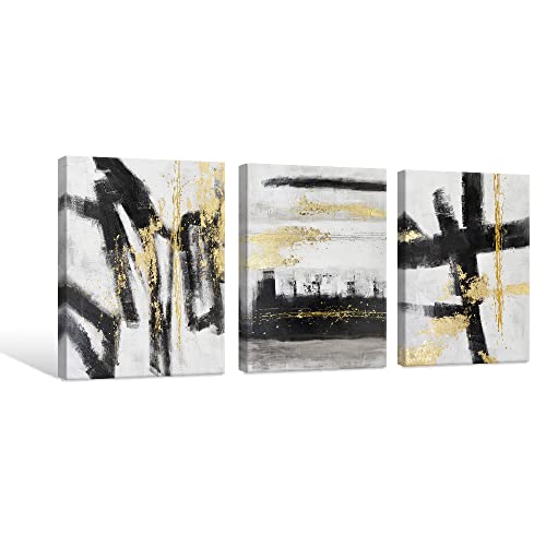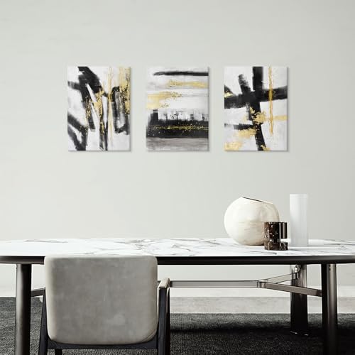 7Fisionart - لوحة فنية قماشية جدارية بطباعة تجريدية باللونين الأبيض والأسود ذهبية عصرية مطبوعة باطار لغرفة المعيشة والمكتب وغرفة النوم، جاهزة للتعليق 30 سم × 40 سم × 3 قطع من 7 فيزيون ارت، أسود وأبيض
