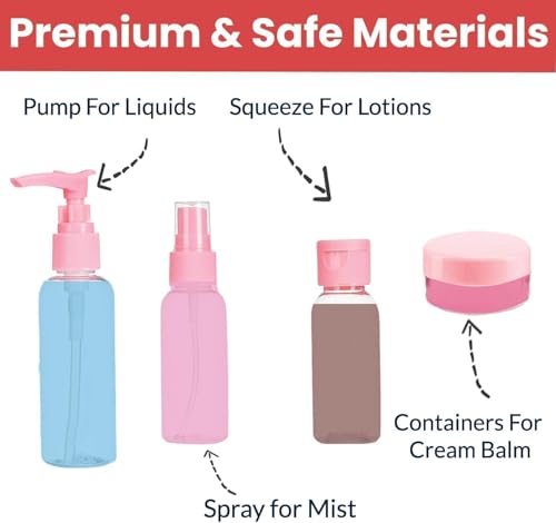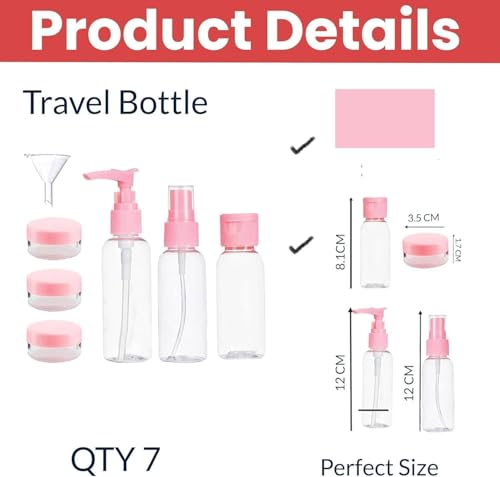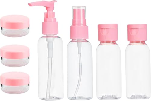 - مجموعة سفر كاملة مكونة من 7 قطع - تتضمن زجاجة مضخة وزجاجة رذاذ وزجاجات بغطاء قلاب وبرطمانات كريم صغيرة. مثالي للشامبو واللوشن والتونر والزيوت والكريمات والضروريات اليومية.