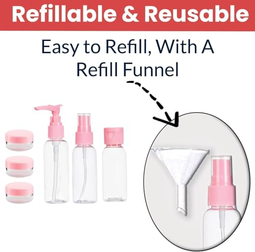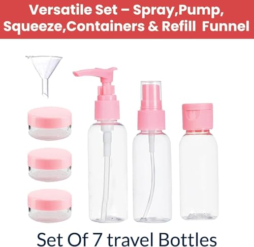 WINZI - مجموعة زجاجات مستحضرات التجميل للسفر (7 قطع) - حاويات صغيرة قابلة لاعادة الملء للشامبو واللوشن والعناية بالبشرة - مجموعة سفر فارغة مع مضخة وبخاخ وبرطمانات - محمولة وخفيفة الوزن للاستخدام اليومي