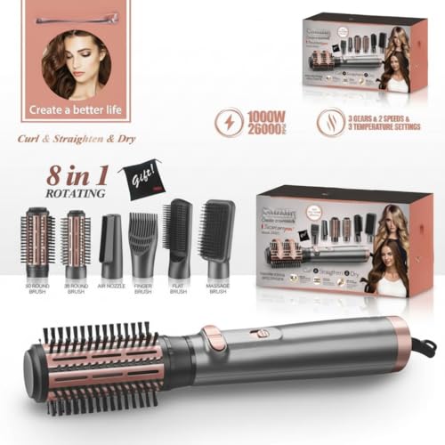 - 8 وظائف في 1: يجمع بين استشوار، فرشاة تمليس، فرشاة لف، فرشاة تجعيد، ومجفف شعر. تخلص من فوضى الأدوات المتعددة واستمتع بحل شامل لتصفيف الشعر.