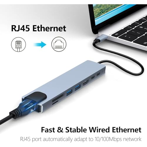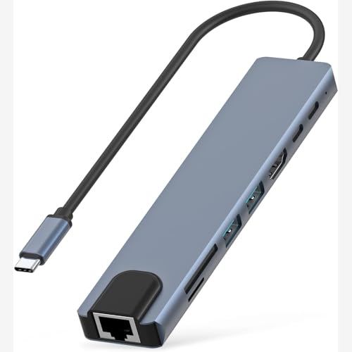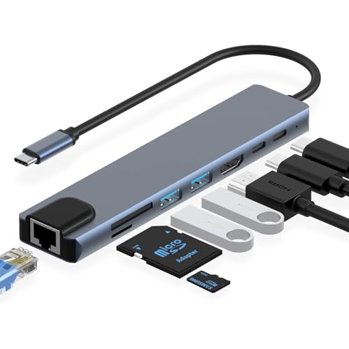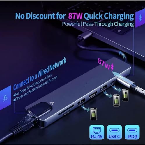 Generic - موزع USB نوع C من خليط الألومنيوم 8 في 1 بتوافق شامل مع منفذ 4K HDMI ومنفذ USB 3.0 مزدوج ومنفذ USB-C مزدوج (توصيل طاقة 87 وات) ومنفذ ايثرنت RJ45 وقارئ بطاقات SD/TF