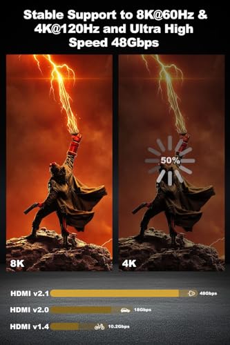 - تجربة لعب فائقة -- بالمقارنة مع كيبل HDMI 4K، يوفر كيبل HDMI 8K صوتًا عالي الدقة وأعلى جودة صوت. كما أنه يدعم معدل التحديث المتغير (VRR)، مما يحل مشكلة تجميد الصورة وتمزيقها من أجل لعب أكثر سلاسة.