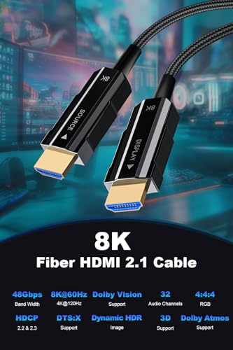 RUBMUD - كابل HDMI بصري بدقة 8K، أداء فائق بسرعة 48Gbps، يدعم 8K@60Hz و4K@120Hz، مع تقنية المدى الديناميكي العالي HDR وصوت محيطي Dolby ووضوح مذهل لتجربة ألعاب رائعة والاستمتاع بالمسرح المنزلي، طول 30 م