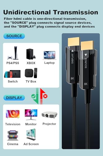 - نقل أحادي الاتجاه -- كيبل HDMI من الألياف الضوئية هو نقل أحادي الاتجاه. المقابس في كل طرف تحمل علامة "المصدر" و"العرض". يربط قابس "المصدر" أجهزة مصدر الإشارة مثل تي في بوكس وبلاي ستيشن 5 وبلاي ستيشن 4 وبلاي ستيشن 3 ومشغلات بلو راي وسلسلة اكس بوكس واللابتوب وما إلى ذلك. يربط قابس "العرض" أجهزة العرض الطرفية مثل التلفزيون والشاشات وجهاز العرض والشاشة وما إلى ذلك. يرجى التأكد من توصيل كل طرف بشكل صحيح، ولن تحصل على إشارة من الجهاز.