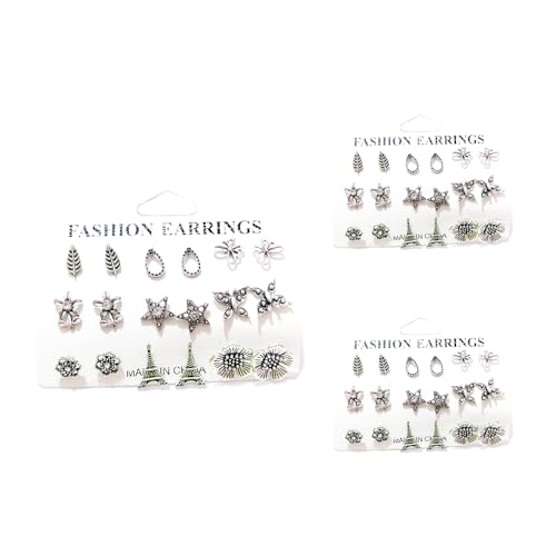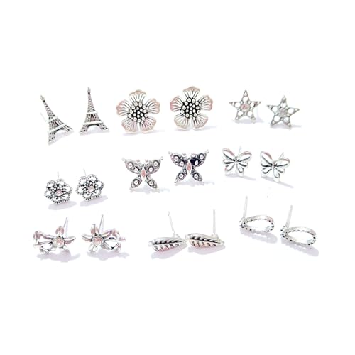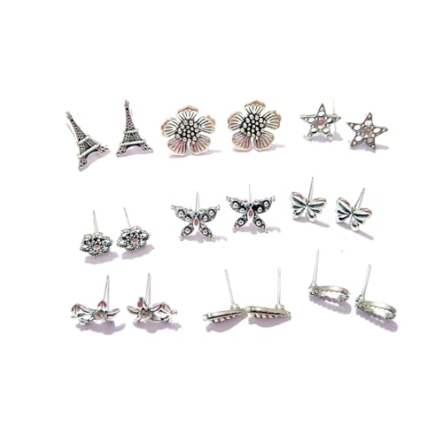 Generic - 9 حلقان، حلق اكسسوار لون فضة عتيقة اشكال مختلفة - حلق احجار حريمي بوهو، تصميم 4، طقم 3
