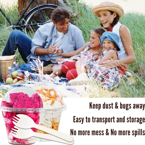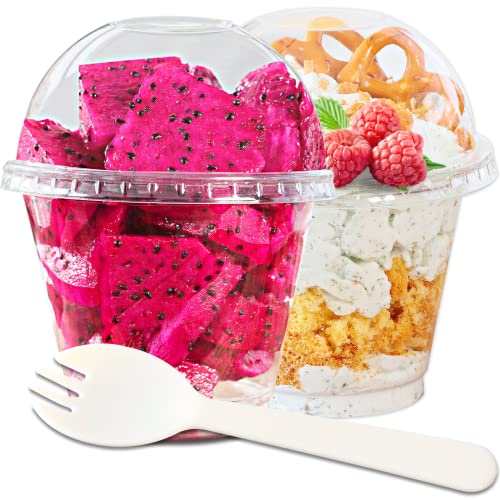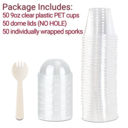 Aestleaf - اكواب بلاستيكية صغيرة شفافة مع اغطية على شكل قبة غير مثقوبة وملعقة مشوكة مصنوعة من بي اي تي تستعمل مرة واحدة للحلوى - الفاكهة - ايس كريم - كب كيك - مشروبات مثلجة مجموعة 50 كوب قياس 9 اونصة استليف زهري