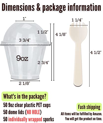 Cappatua - اكواب من البلاستيك الشفاف ومادة بي اي تي سعة 9 اونصة مع اغطية بدون فتحة ومعلقة بشوكة، كوب للوجبات الخفيفة والفاكهة والحفلات للاستعمال مرة واحدة ومقاومة للتسرب قبة للحلوى والبارفيه، 50 مجموعة، كاباتوا.