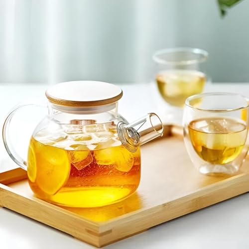 Generic - وعاء شاي اعشاب زجاجي سعة 950 مل، يتضمن ثلاجة و4 اكواب ومصفاة داخلية وغطاء خشبي وفلتر ستيل لصنع المشروبات الطبيعية