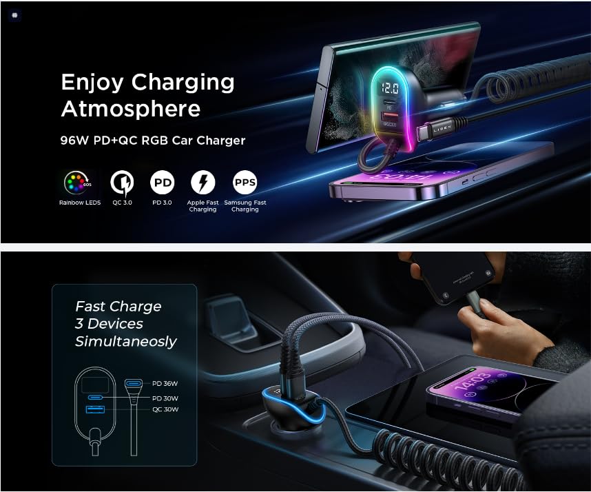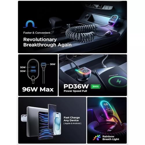 - قوة شحن فائقة: شاحن سيارة بقوة 96 واط مع منفذ USB-C PD بقوة 36 واط ومنفذ QC3.0 بقوة 30 واط لشحن سريع لجهازين في وقت واحد