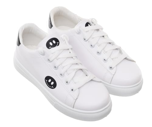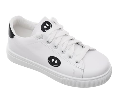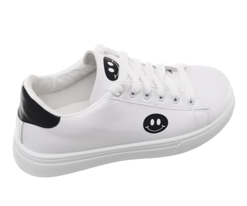 99.99 - حذاء رياضي مسطح من الجلد برباط للنساء 99.99 يتميز بطباعة وجه مبتسم على الجانب (ابيض/اسود، 41)