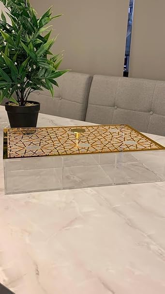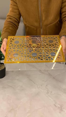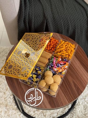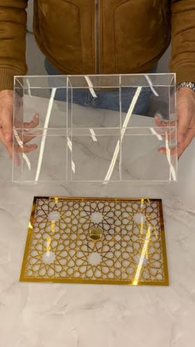- صندوق مقسم صندوق اكريليك 6T + غطاء بسكويت بتصميم ارابيسك ذهبي وفضي فريد للغاية للتقديم والديكور، الحجم: 35 × 24 سم