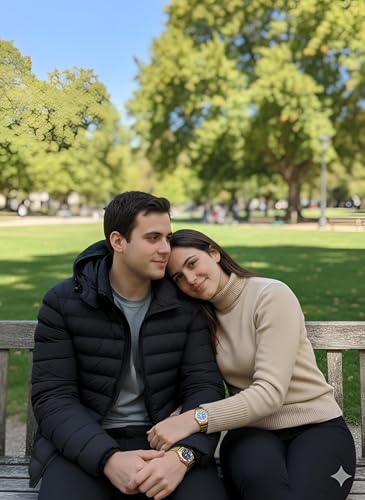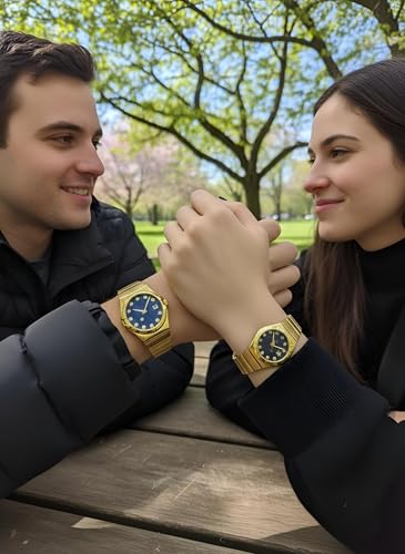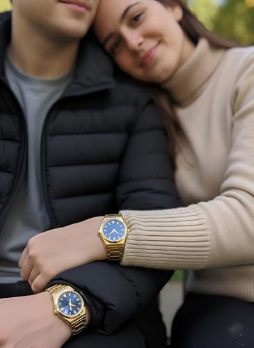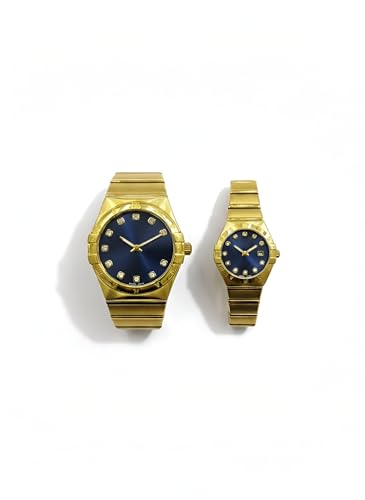 Generic - هدية احتفالية للزوجين - لمسة ذهبية فائقة الساعة من الستانلس ستيل، قرص ازرق لامع وعلامات كريستال، تصميم متناسق للرجال والنساء، هدية مثالية للذكرى السنوية او اعياد الميلاد