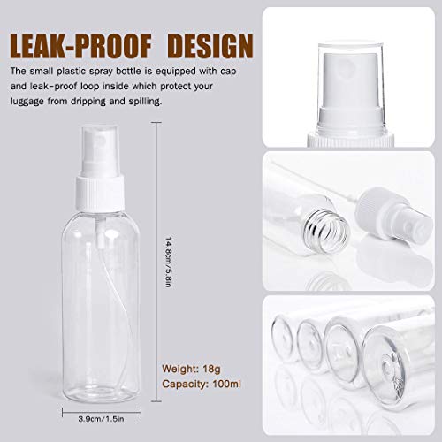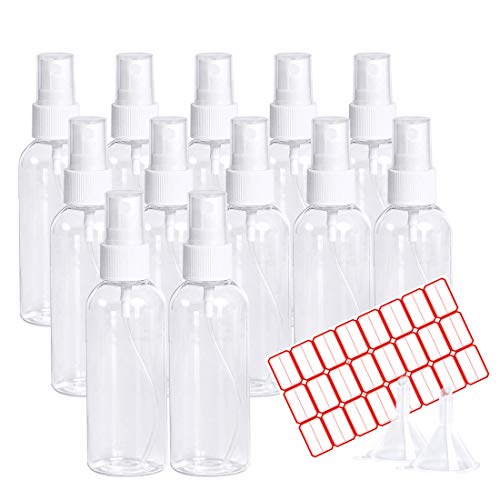 A.DASHER - مجموعة بخاخات بلاستيكية صغيرة شفافة فارغة للسفر، حاويات سائلة صغيرة قابلة لإعادة الملء، بخاخة محمولة لمستحضرات التجميل مع أقماع وملصقات من ايه. دشر، 12 قطعة، سعة 100 مل