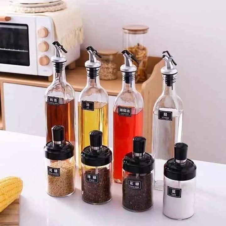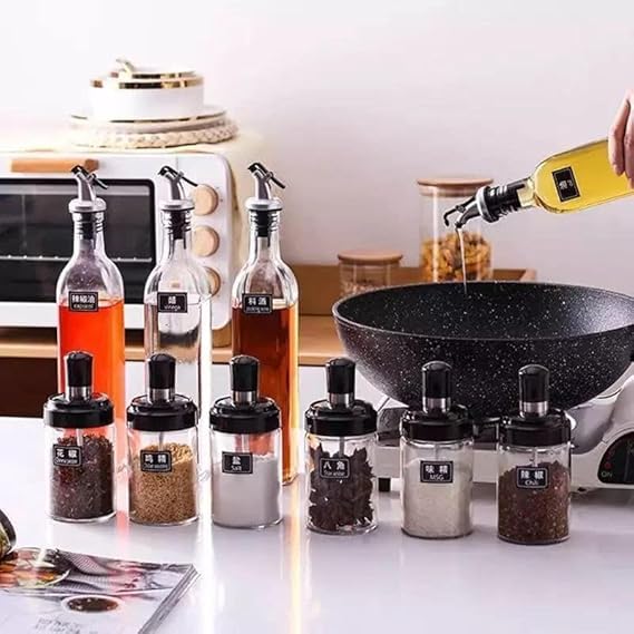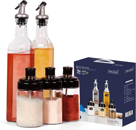 Generic - مجموعة برطمانات توابل زجاجية وزجاجة زيت مع سدادات وعلبة هدايا، زجاجة لتوزيع زيت الزيتون والخل بسعة 502 مل (قطعتان) وعلب توابل سعة 296 مل مع طقم معالق من 3 قطع