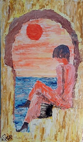 - عمل فني أصلي: لوحة تأملية مرسومة يدوياً بسكين الألوان بأسلوب فني مميز يعكس لحظة تأمل هادئة عند البحر