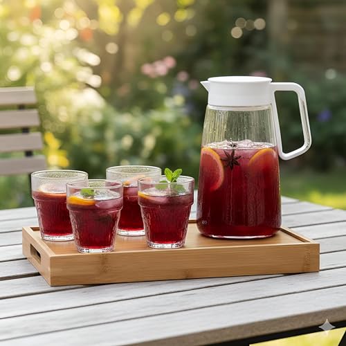 - تسمح فوهة الإبريق الواسعة بالصب السهل دون انسكاب، بينما توفر الأكواب الزجاجية المتينة قبضة مريحة.
