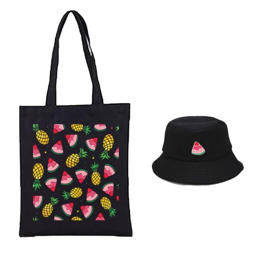 - مجموعة من شنطة توت سوداء وقبعة دلو سوداء مناسبة للرحلات والعطلات الصيفية بأشكال وألوان مميزة