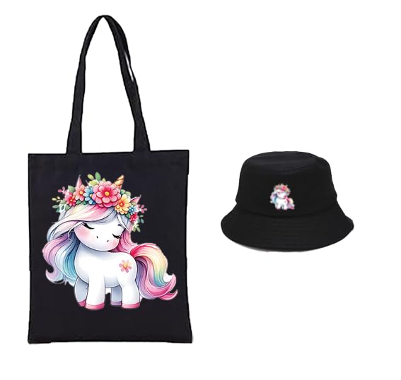 Generic - مجموعة يونيكورن تتضمن شنطة يد سوداء وقبعة سوداء (نوع A)، مناسبة للرحلات والعطلات الصيفية بتصاميم وألوان فريدة