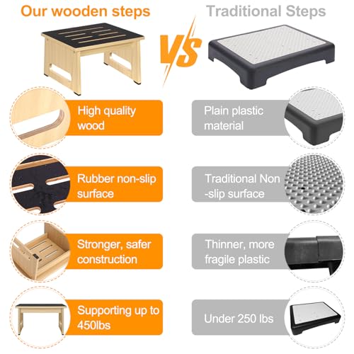 - سطح مداس مانع للانزلاق: يتميز المقعد الخشبي الخاص بنا بمساحة سطح أكبر تبلغ 15.75 انش × 12.6 انش. مغطاة بمطاط غير قابل للانزلاق لتقليل الانزلاق عند الصعود أو النزول. توجد أيضًا وسادات غير قابلة للانزلاق أسفل المقعد. وهو أمر ضروري لسلامة الأطفال وكبار السن. يوفر المقعد المتدرج الخاص بنا دعمًا عاليًا 5.3 انش ويعمل بمثابة رفع متدرج للوصول إلى مستويات أعلى.