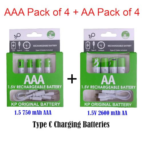- بطاريات AA 2600mAh + AAA 750mAh قابلة لإعادة الشحن، بطارية ليثيوم أيون 1.5 فولت USB قابلة لإعادة الشحن AA+AAA مع كابل شحن USB Type C، خرج ثابت 1200 دورة، 4 عبوات AA و4 عبوات AAA
