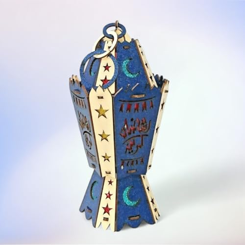 Generic - فانوس رمضان ليد مزخرف بتصميم خشبي مقصوص بالليزر مع تصميم نجوم وقمر وشكل مربع AA122، أزرق