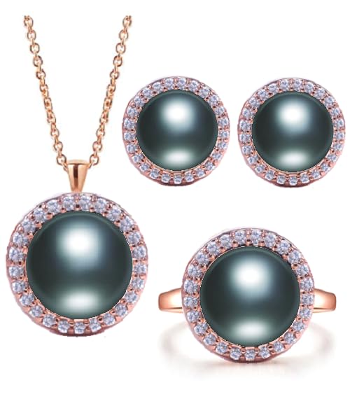 Generic - طقم مجوهرات فاخرة للنساء من اللؤلؤ الطبيعي النقي معدل نقاء AAAA والفضة الاسترليني عيار 925 مطلي روز جولد مطعم بالكريستال