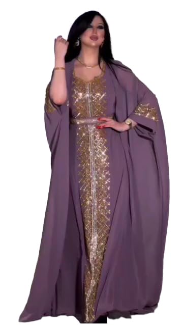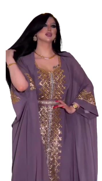 ELASLY Store - عباية استقبال للنساء، مصنوعة من الشيفون، بتطريز ذهبي أنيق، مكونة من ثلاث قطع مع حزام