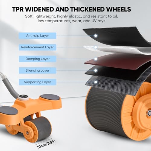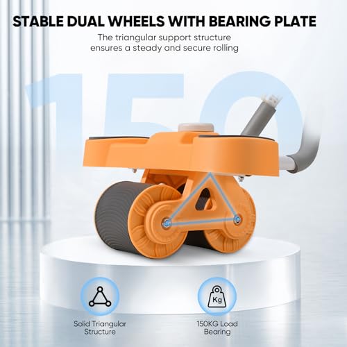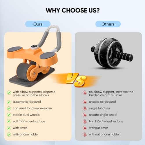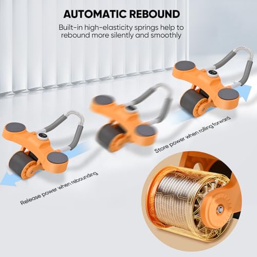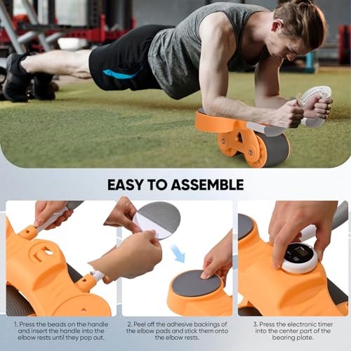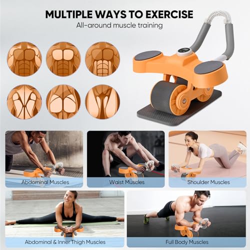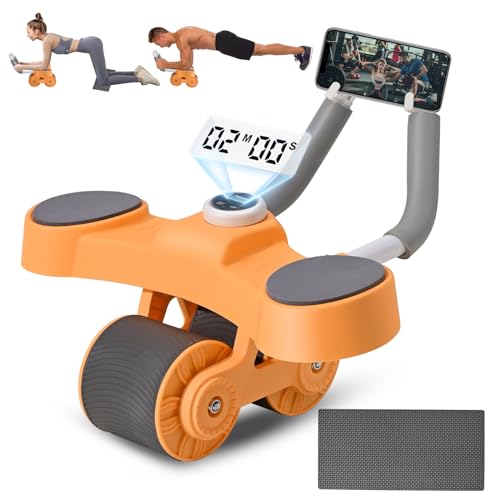 BADGESHAND - جهاز تمارين عضلات البطن، معدات تمرين عضلات البطن الأساسية، جهاز مزود بعجلة دوارة تلقائية الارتداد لتمارين الخصر ملائم للمدرب الرئيسي يتضمن مؤقت وحامل موبايل (برتقالي)
