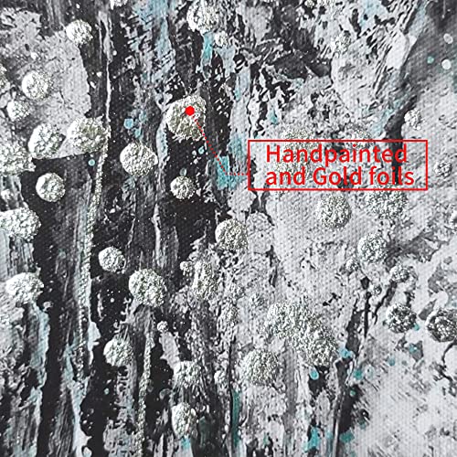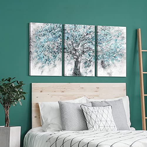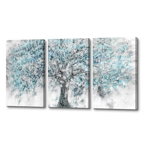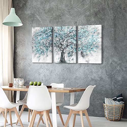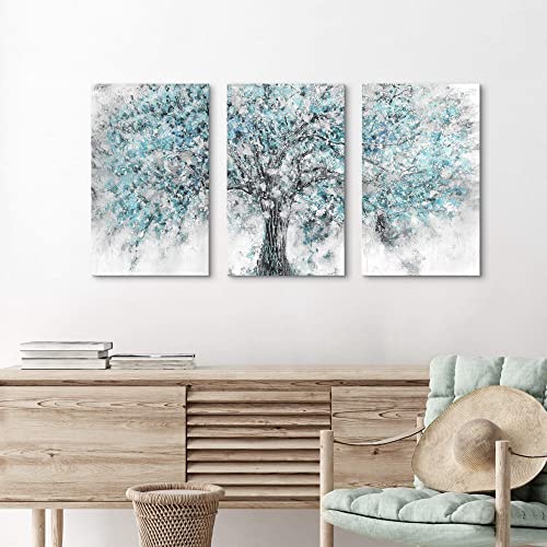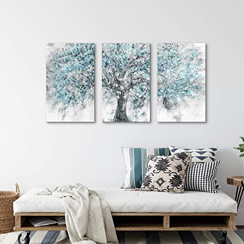 ArtSquare - لوحة فن تجريدي جدارية مؤطرة من القماش لوحة كبيرة برسم شجرة بلون أزرق مخضر بتصميم غابة مزهرة، أعمال فنية طبيعية مرسومة باليد من رقائق فضية لامعة لغرفة المعيشة وغرفة النوم والمكتب، 3 قطع