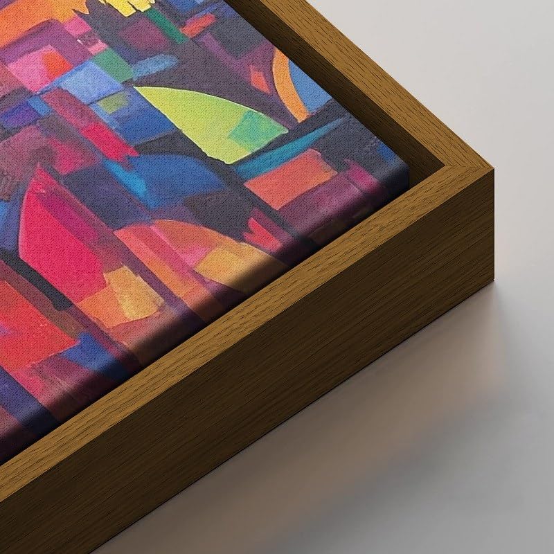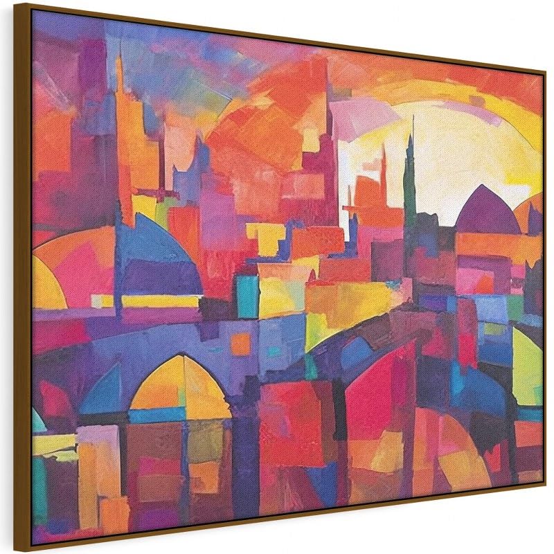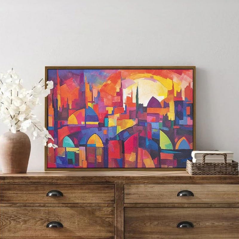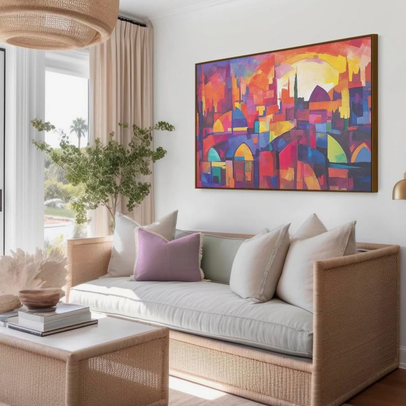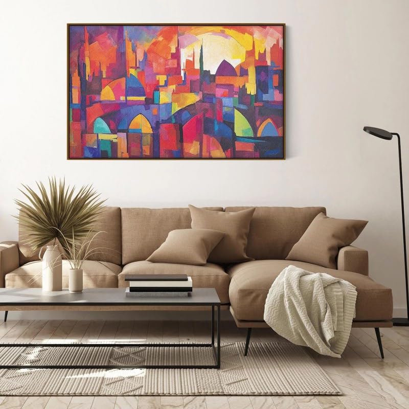 Home Gallery - لوحة فنية جدارية تجريدية بتصميم مدينة مع سماء زرقاء وشمس حمراء بإطار، 1.2 م× 80 سم