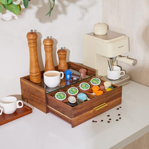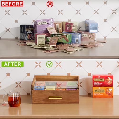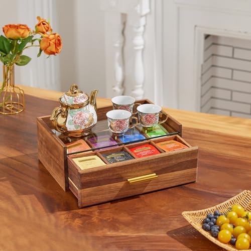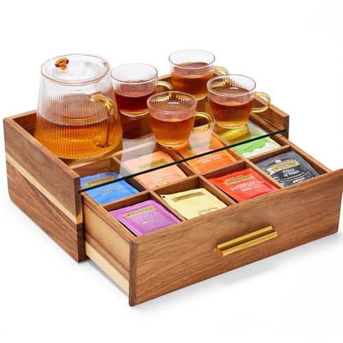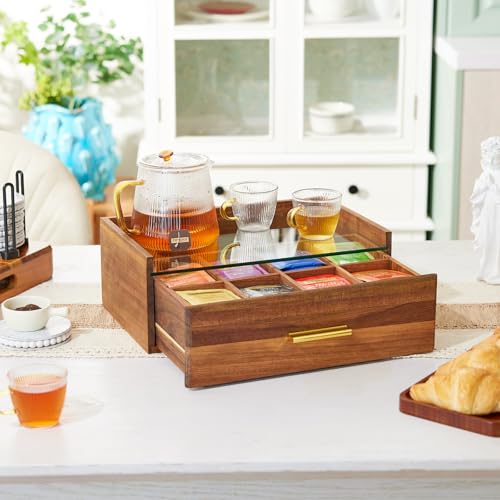 HouseJoy - منظم أكياس الشاي من خشب الأكاسيا، صندوق شاي مع درج تخزين، يحوي 8 أقسام لتنظيم أكياس الشاي مع نافذة زجاجية، منظم لكبسولات القهوة وأكياس الشاي، حامل أكياس الشاي لسطح الطاولة