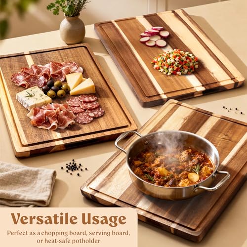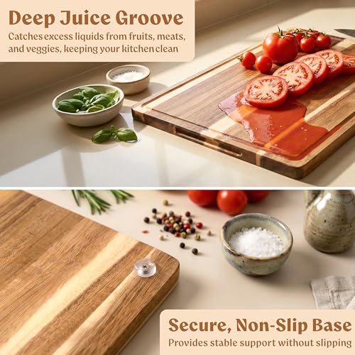 - لوح تقطيع فاخر من خشب الأكاسيا مقاس XXL - مصنوع من خشب الأكاسيا عالي الجودة بسمك 0.8 انش، تم تصميم مجموعة ألواح التقطيع المتينة والمقاومة للرطوبة والصديقة للسكين لتدوم طويلاً. يسمح التصميم ذو الوجهين باستخدامه كلوح تقطيع ولوح تقديم أنيق.