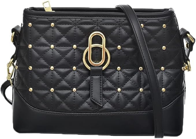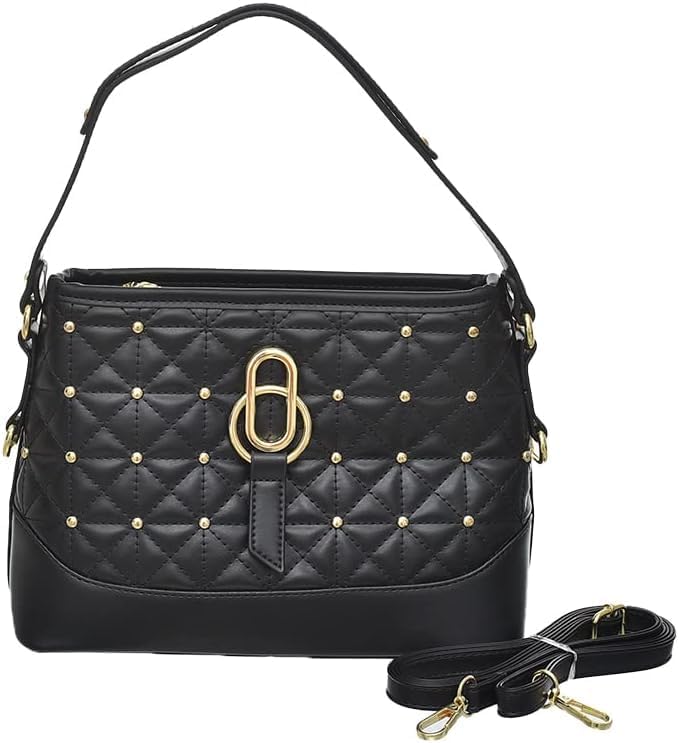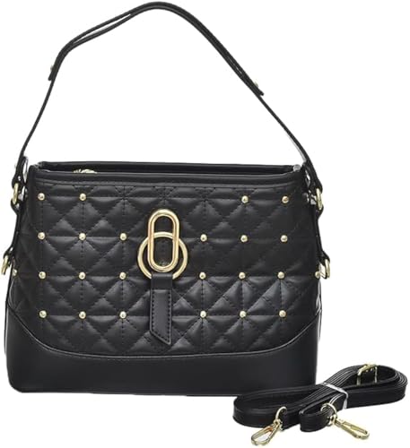 Generic - شنطة يد جلد بتصميم كلاسيكي مع حزام كتف وستراس ذهبي للنساء من اكسيسوريز شوب، أسود