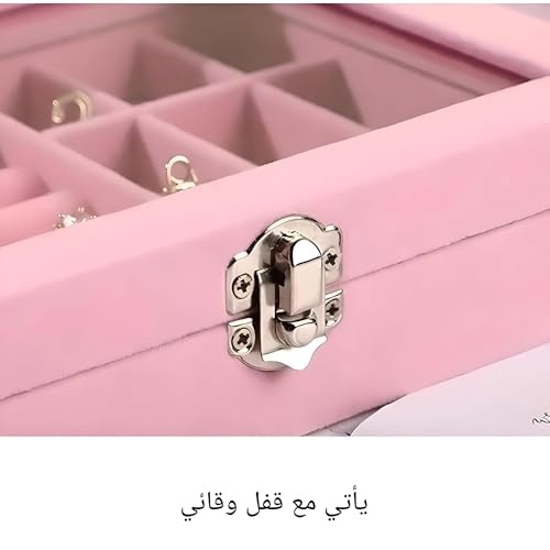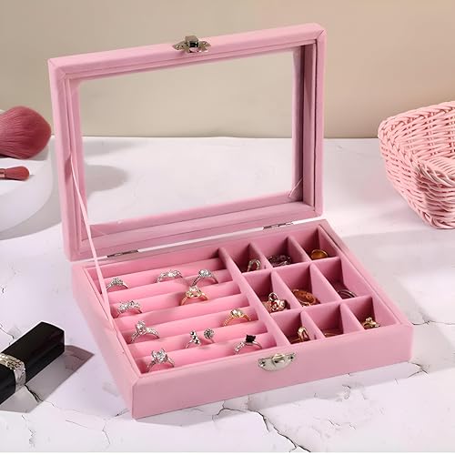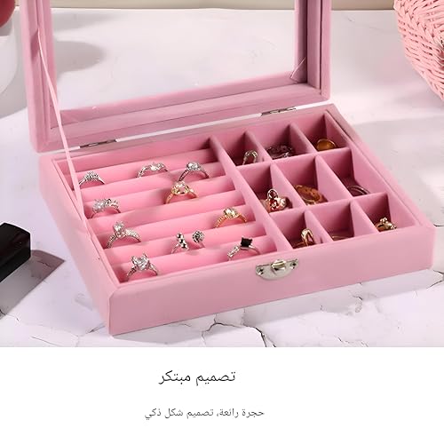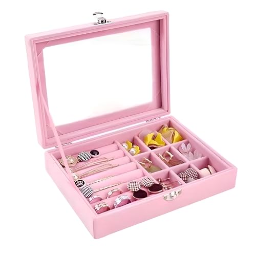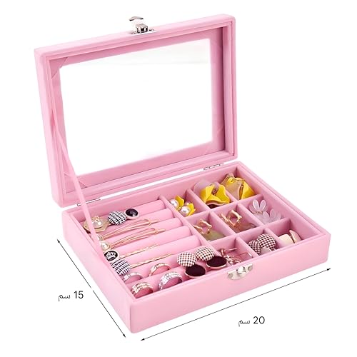 Generic - منظم إكسسوارات وعلبة تخزين مجوهرات بقماش قطيفة وردي ناعم مع غطاء شفاف لحفظ الخواتم والسلاسل والأساور، مناسب للفتيات بحجم صغير 20×15 سم