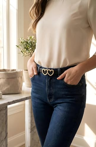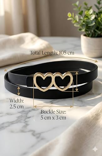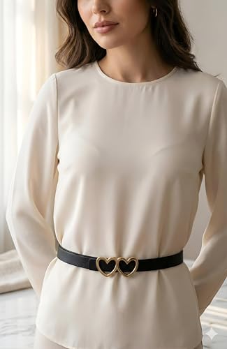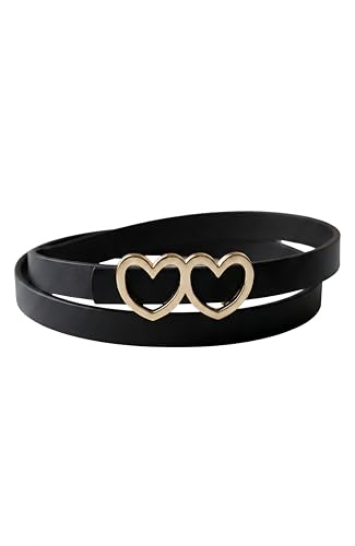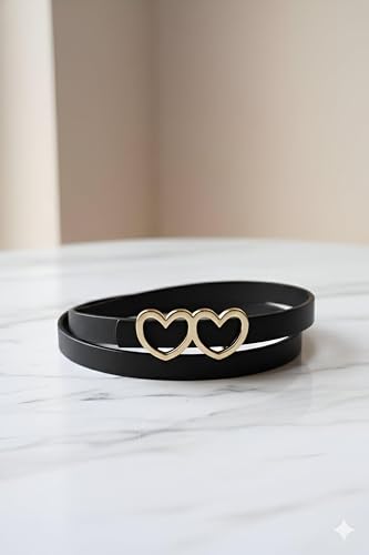 Generic - اكسسوار - حزام رفيع من الجلد الصناعي للنساء يتميز بابزيم على شكل قلب مزدوج وتفاصيل ذهبية اللون لارتداء عصري