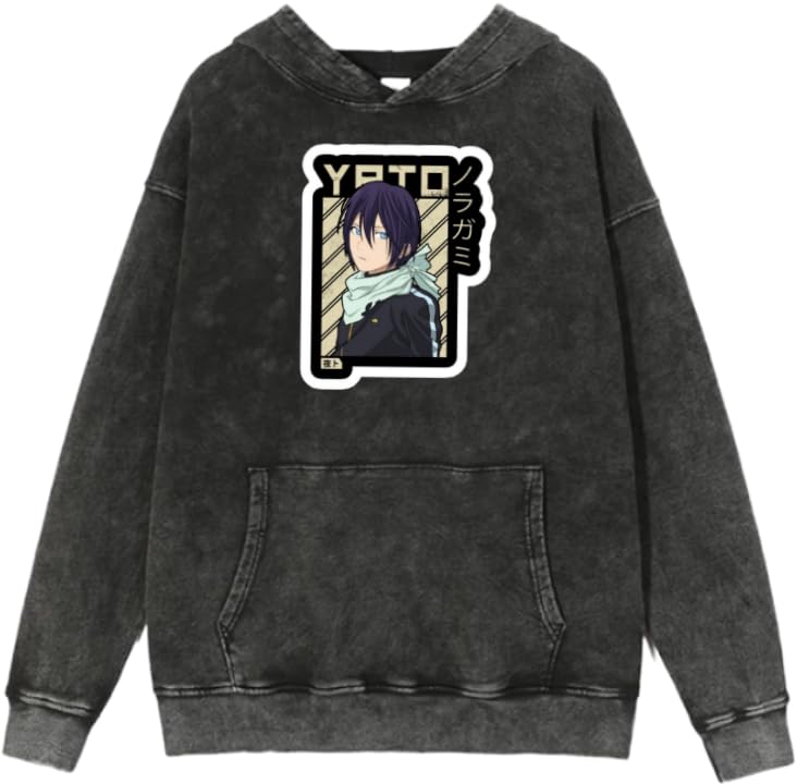Generic - سويت شيرت بغطاء للرأس بتصميم كبير مع طباعة لشخصية أنيمي نورجامي 5 للشباب، لون رمادي (acid wash gray)